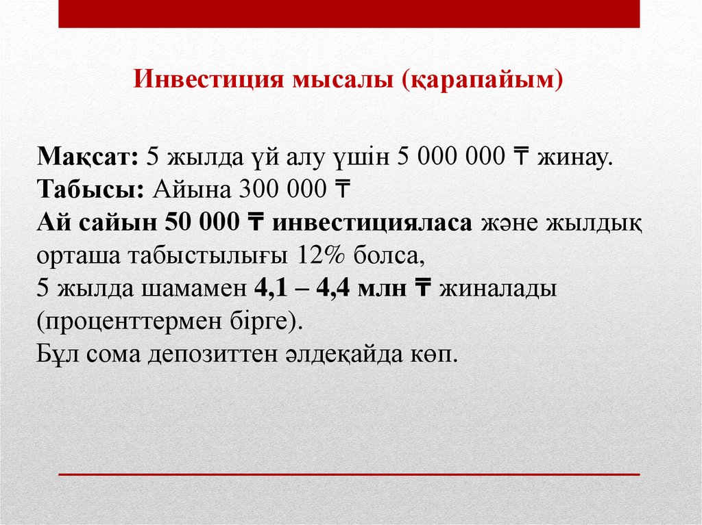 Инвестиция мысалы (қарапайым)Мақсат: 5 жылда үй алу үшін 5 000 000 ₸ жинау.