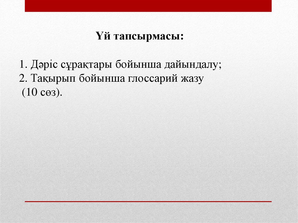 Үй тапсырмасы:1. Дәріс сұрақтары бойынша дайындалу;