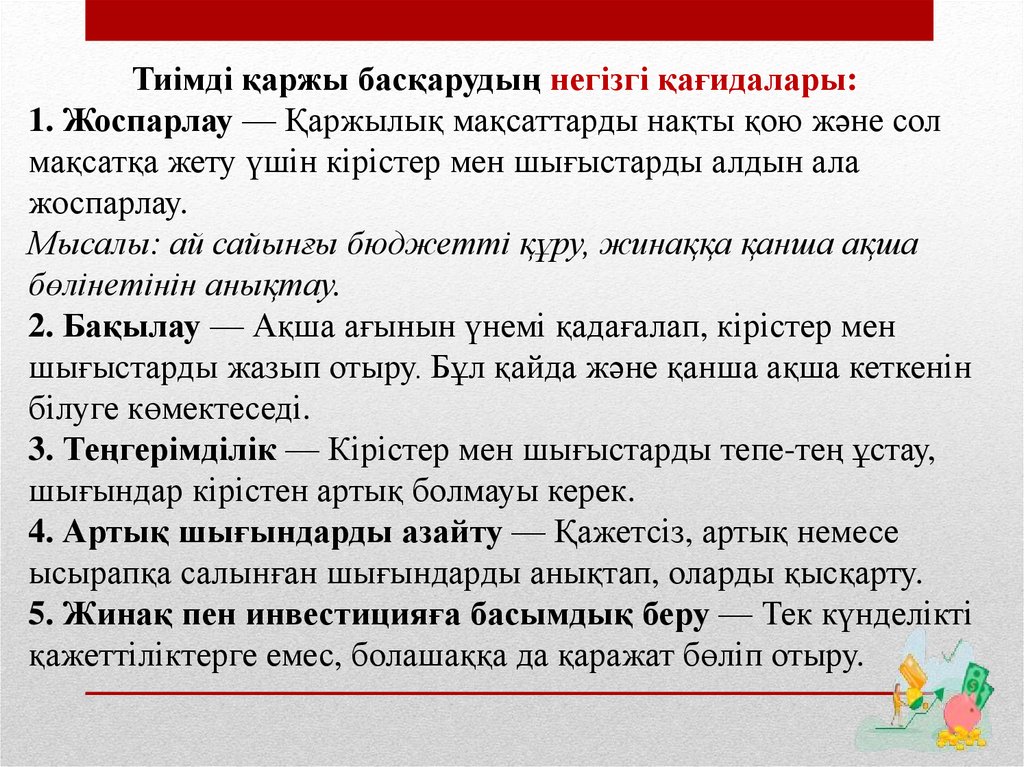 Тиімді қаржы басқарудың негізгі қағидалары:1. Жоспарлау — Қаржылық мақсаттарды нақты қою және сол