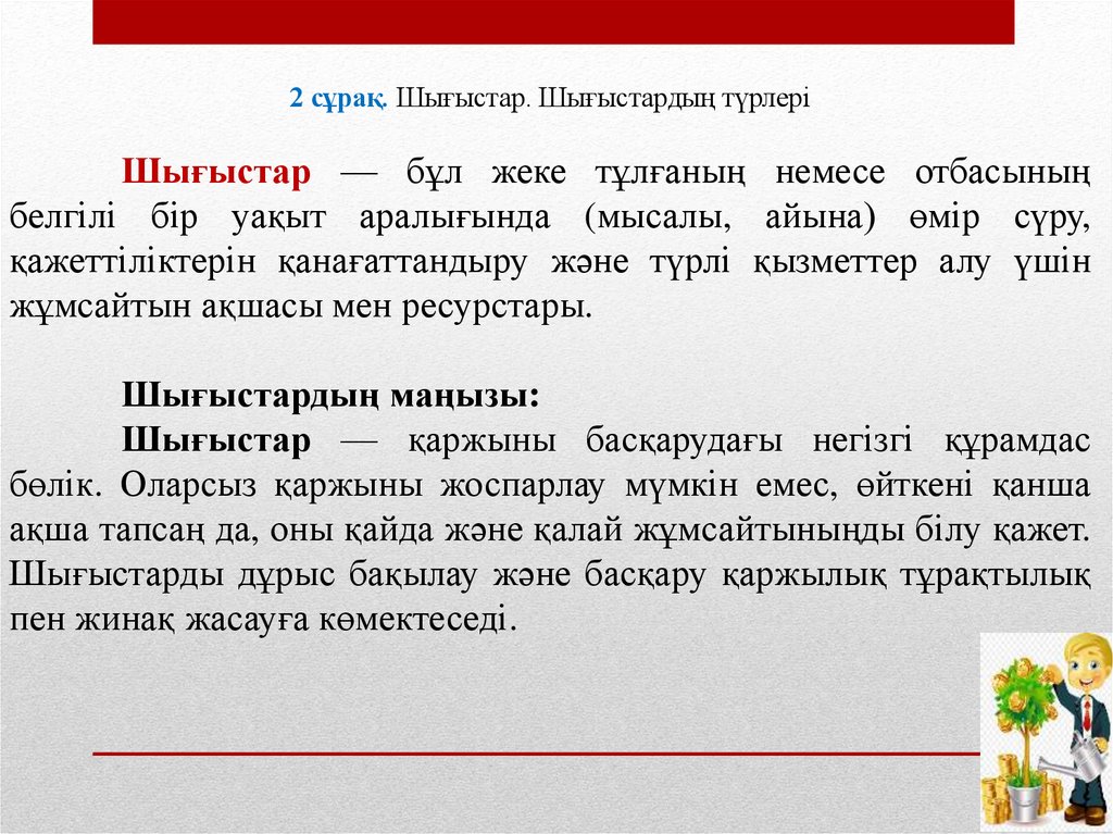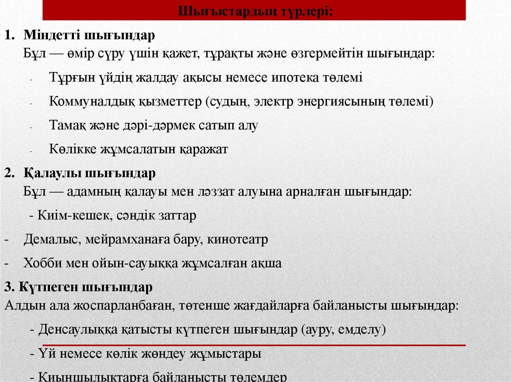 2 сұрақ. Шығыстар. Шығыстардың түрлеріШығыстар — бұл жеке тұлғаның немесе отбасының
