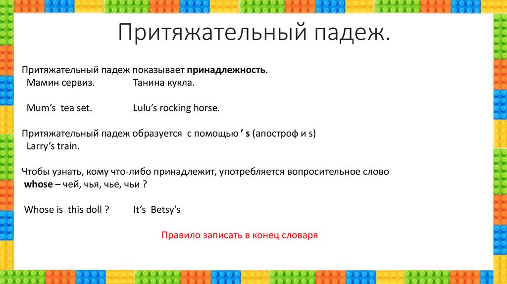 Притяжательный падеж.Притяжательный падеж показывает принадлежность.