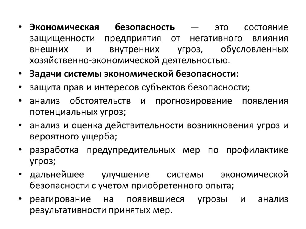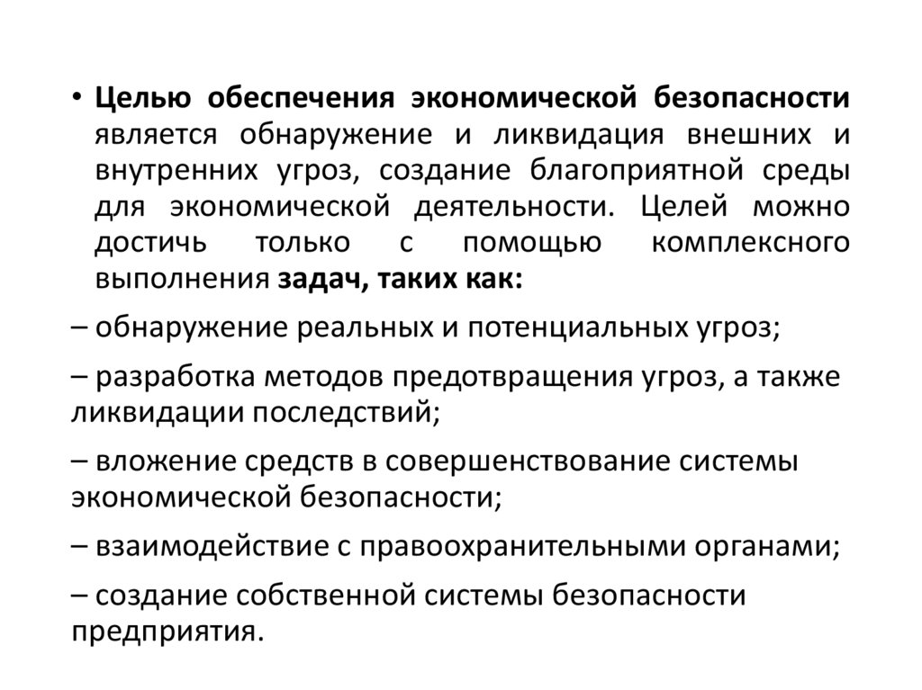 • Задачи системы экономической безопасности: