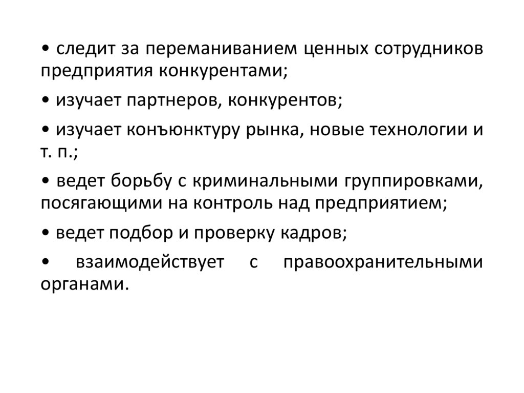• следит за переманиванием ценных сотрудниковпредприятия конкурентами;
