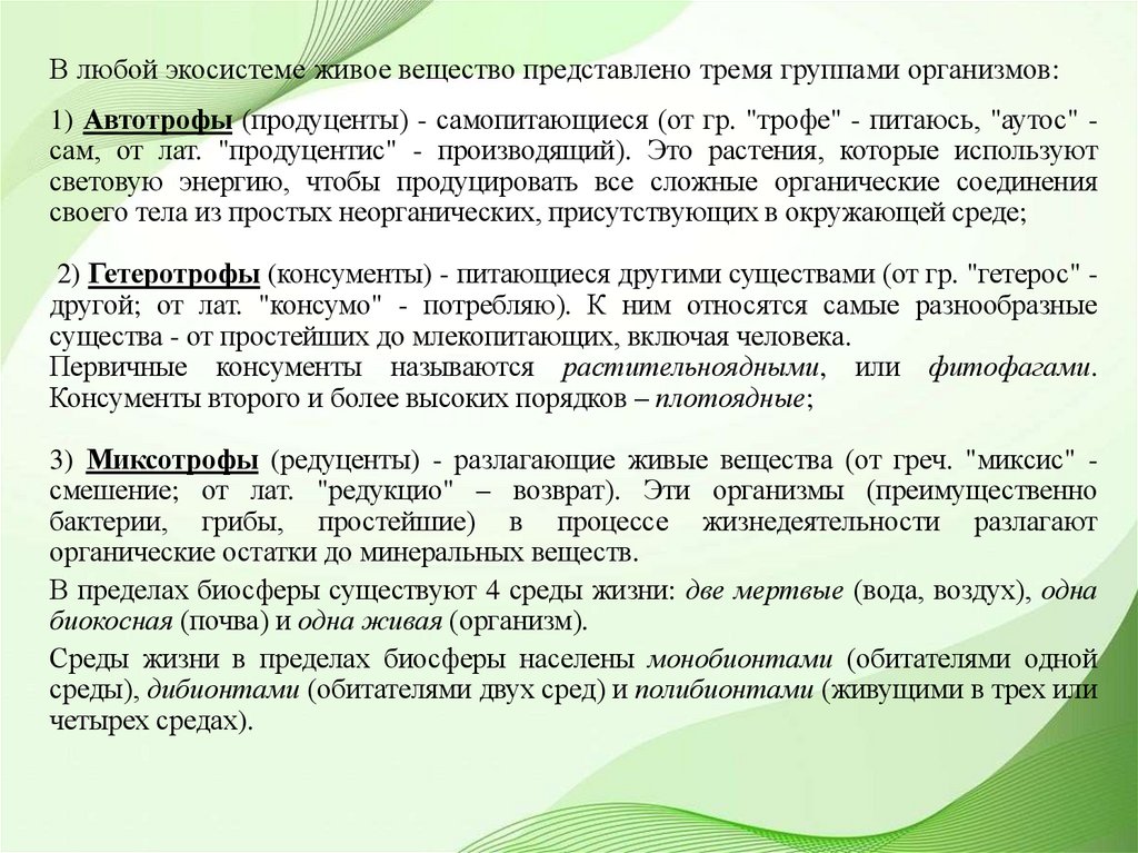 В любой экосистеме живое вещество представлено тремя группами организмов:1) Автотрофы (продуценты) - самопитающиеся (от гр. "трофе" - питаюсь, "аутос" сам, от лат. "продуцентис" - производящий). Это растения, которые используют