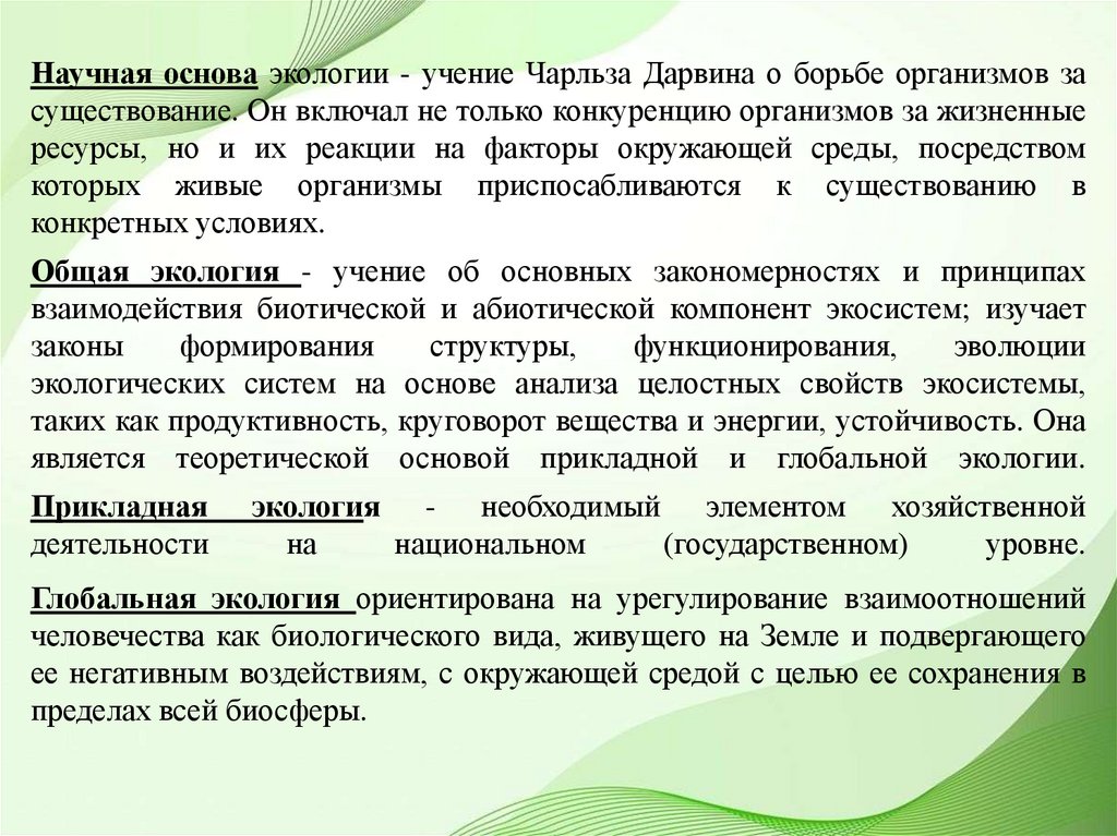 Научная основа экологии - учение Чарльза Дарвина о борьбе организмов засуществование. Он включал не только конкуренцию организмов за жизненные