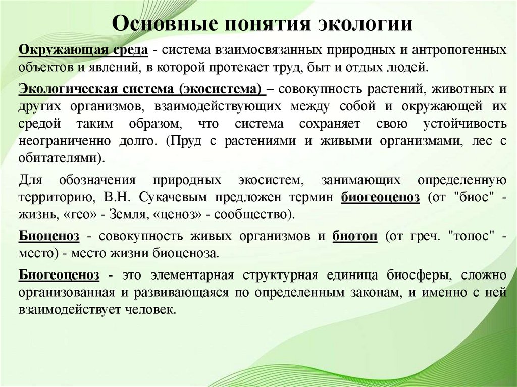 Основные понятия экологииОкружающая среда - система взаимосвязанных природных и антропогенных