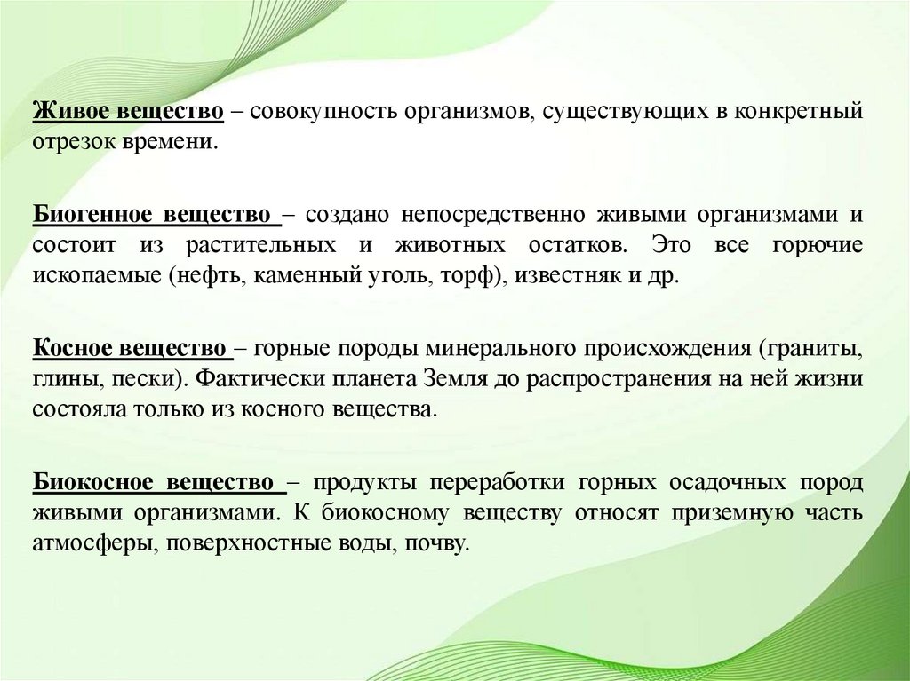 Живое вещество – совокупность организмов, существующих в конкретныйотрезок времени.