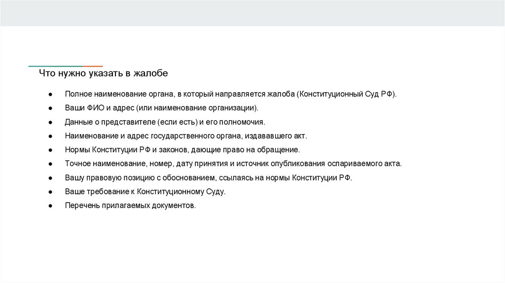 Что нужно указать в жалобеПолное наименование органа, в который направляется жалоба (Конституционный Суд РФ).