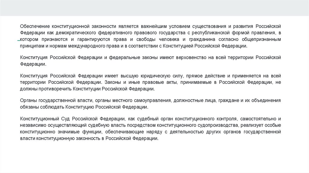 Обеспечение конституционной законности является важнейшим условием существования и развития РоссийскойФедерации как демократического федеративного правового государства с республиканской формой правления, в