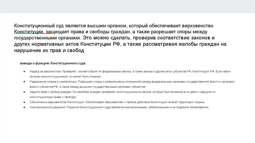 Конституционный суд является высшим органом, который обеспечивает верховенствоКонституции, защищает права и свободы граждан, а также разрешает споры между