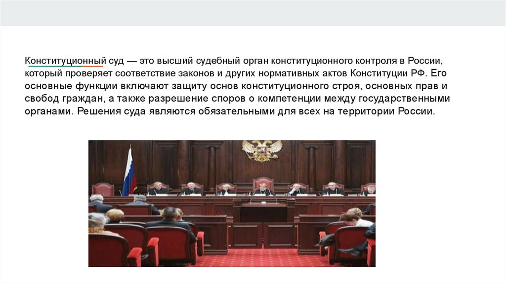 Конституционный суд — это высший судебный орган конституционного контроля в России,который проверяет соответствие законов и других нормативных актов Конституции РФ. Его