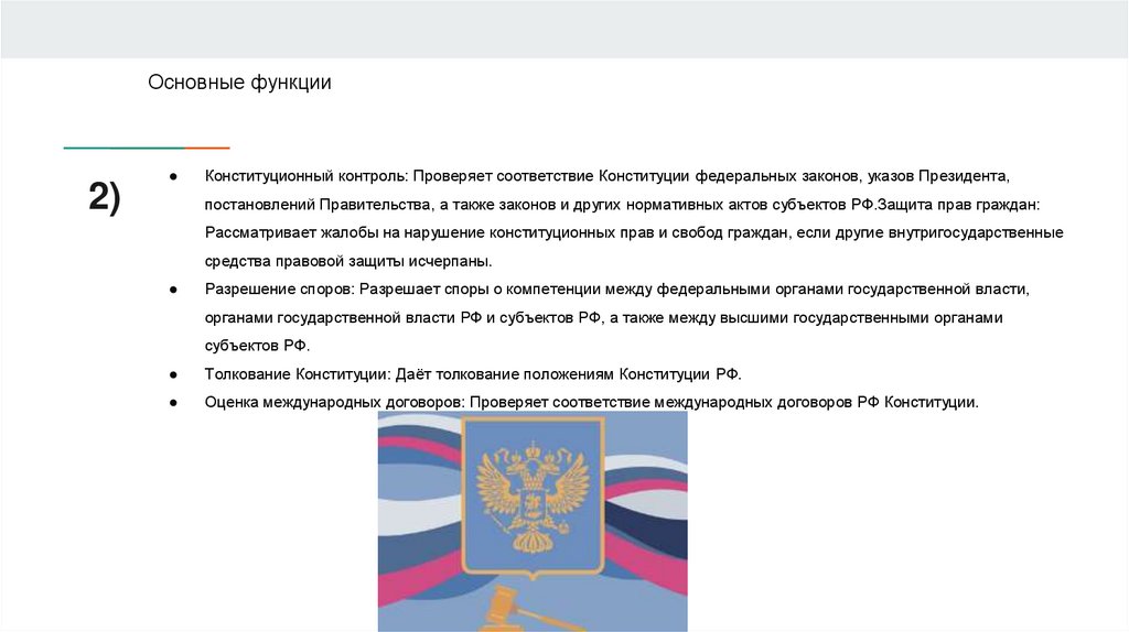 Конституционный контроль: Проверяет соответствие Конституции федеральных законов, указов Президента,