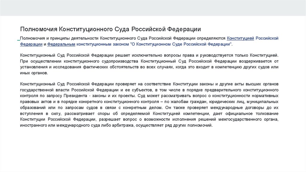 Полномочия Конституционного Суда Российской ФедерацииПолномочия и принципы деятельности Конституционного Суда Российской Федерации определяются Конституцией Российской