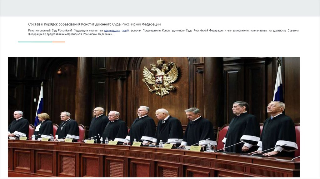 Состав и порядок образования Конституционного Суда Российской ФедерацииКонституционный Суд Российской Федерации состоит из одиннадцати судей, включая Председателя Конституционного Суда Российской Федерации и его заместителя, назначаемых на должность Советом