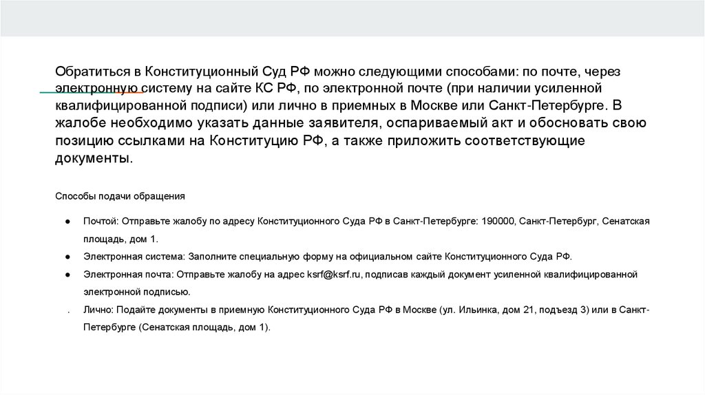 Лично: Подайте документы в приемную Конституционного Суда РФ в Москве (ул. Ильинка, дом 21, подъезд 3) или в СанктПетербурге (Сенатская площадь, дом 1).