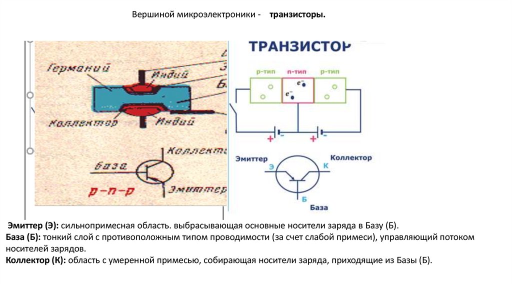 Вершиной микроэлектроники - транзисторы.Эмиттер (Э): сильнопримесная область. выбрасывающая основные носители заряда в Базу (Б).