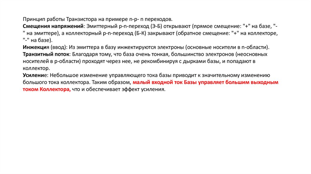 Принцип работы Транзистора на примере n-p- n переходов.Смещения напряжений: Эмиттерный p-n-переход (Э-Б) открывают (прямое смещение: "+" на базе, "" на эмиттере), а коллекторный p-n-переход (Б-К) закрывают (обратное смещение: "+" на коллекторе,