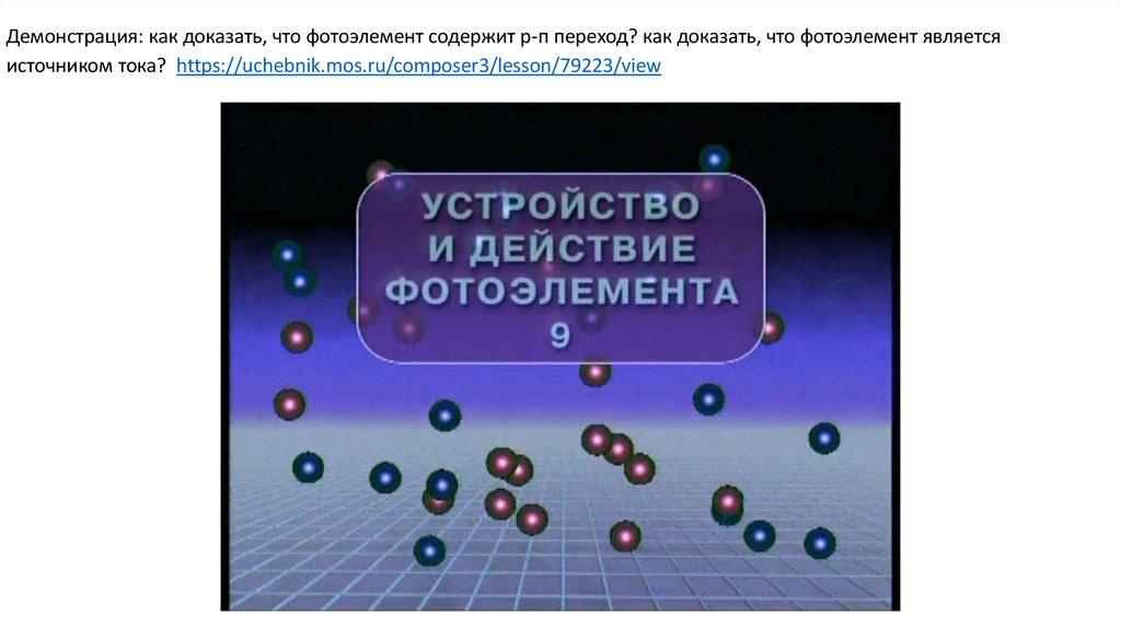 Демонстрация: как доказать, что фотоэлемент содержит р-п переход? как доказать, что фотоэлемент являетсяисточником тока? https://uchebnik.mos.ru/composer3/lesson/79223/view