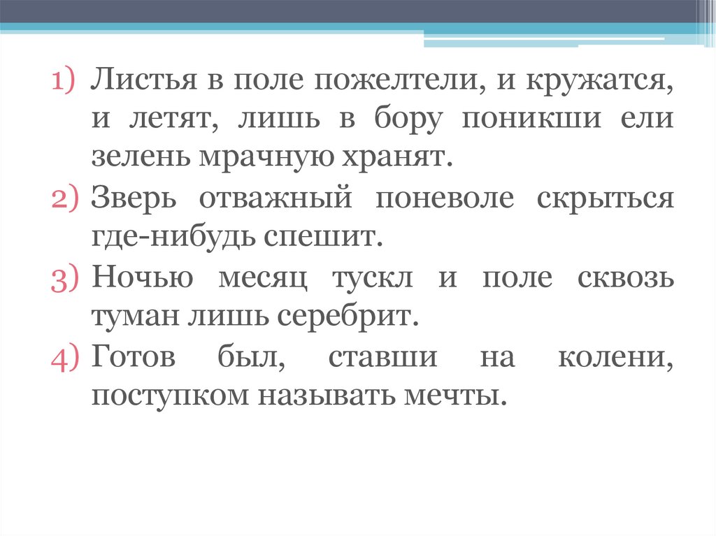 1) Листья в поле пожелтели, и кружатся,и летят, лишь в бору поникши ели