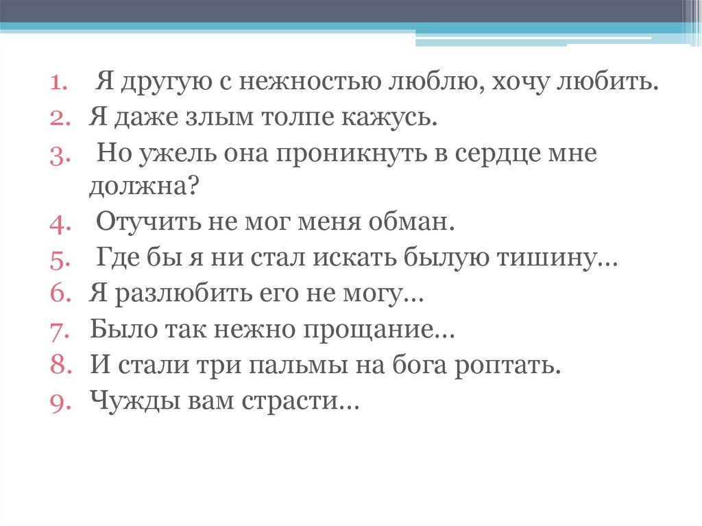 1. Я другую с нежностью люблю, хочу любить.2. Я даже злым толпе кажусь.