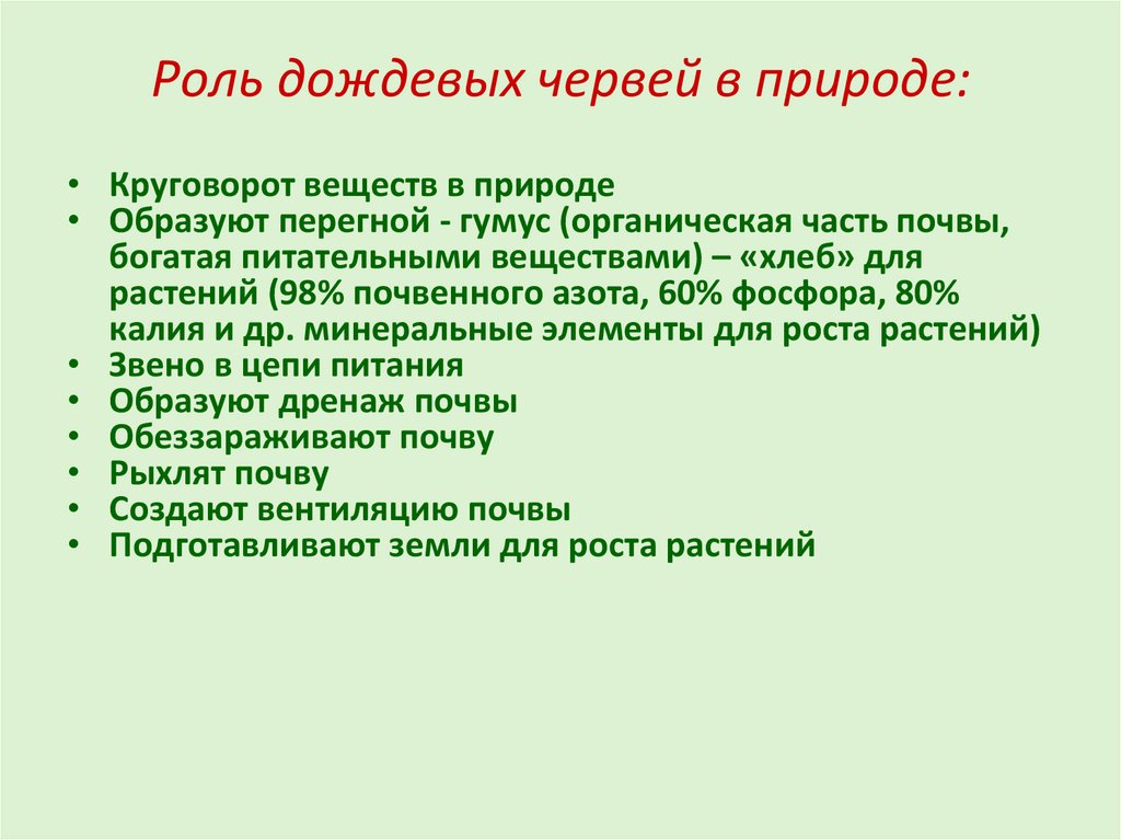 Роль дождевых червей в природе:• Круговорот веществ в природе
