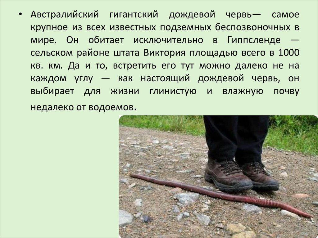 • Австралийский гигантский дождевой червь— самоекрупное из всех известных подземных беспозвоночных в