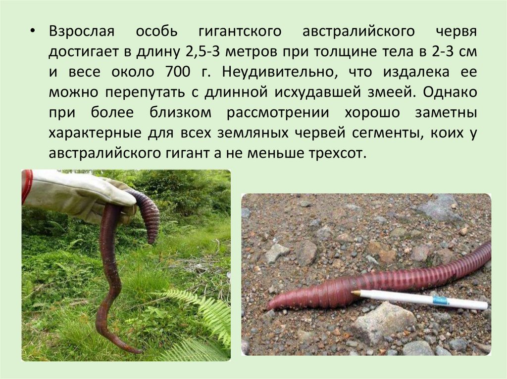• Взрослая особь гигантского австралийского червядостигает в длину 2,5-3 метров при толщине тела в 2-3 см