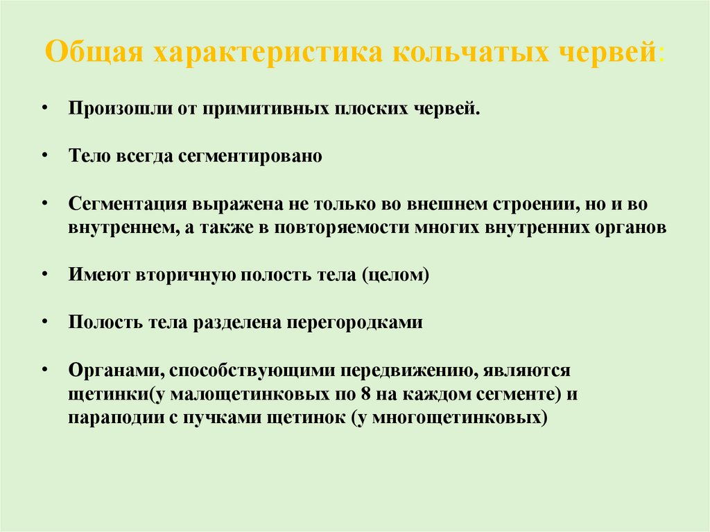 Общая характеристика кольчатых червей:• Произошли от примитивных плоских червей.