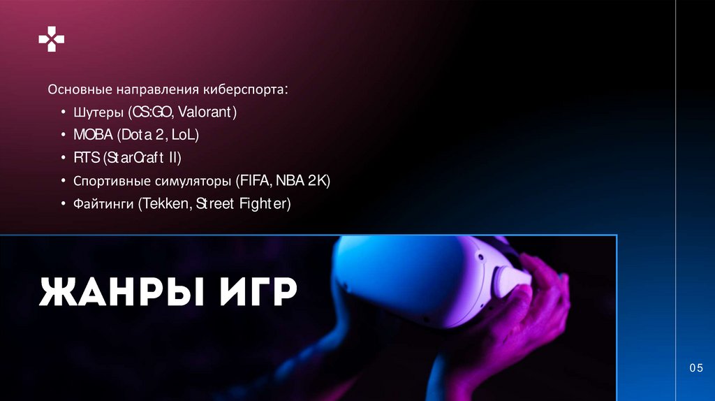 Основные направления киберспорта:• Шутеры (CS:GO, Valorant)