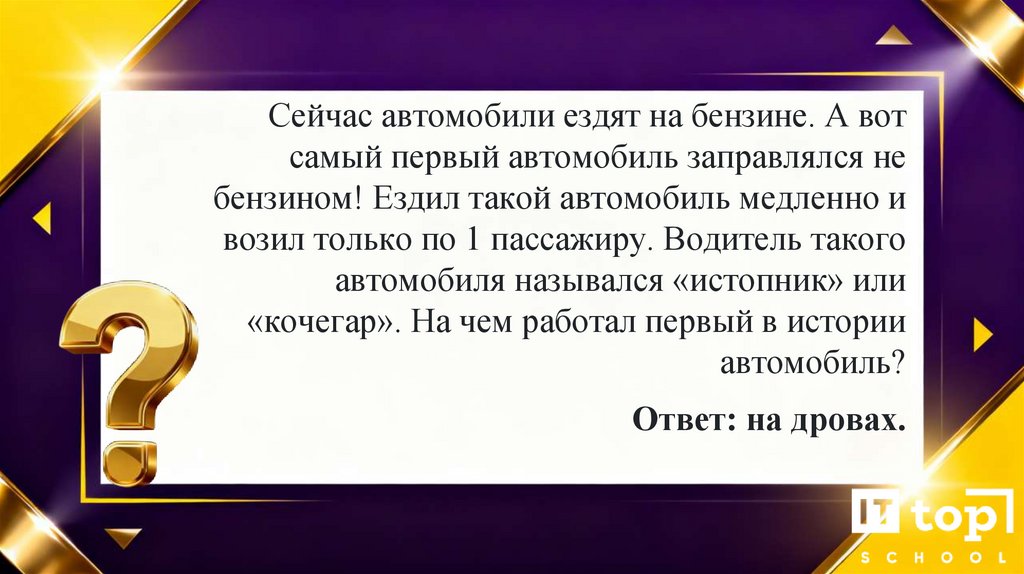 Сейчас автомобили ездят на бензине. А вотсамый первый автомобиль заправлялся не