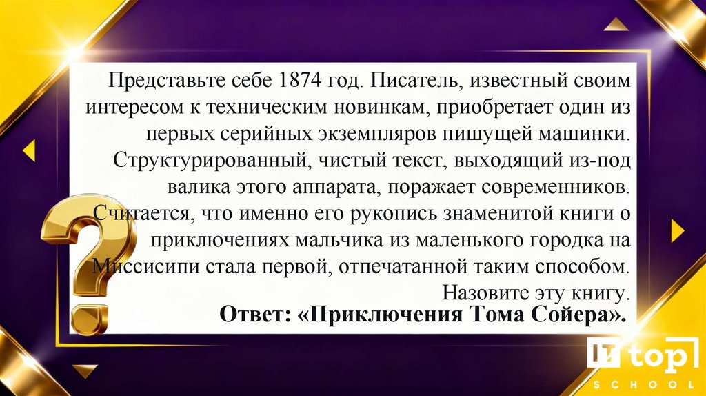 Представьте себе 1874 год. Писатель, известный своиминтересом к техническим новинкам, приобретает один из