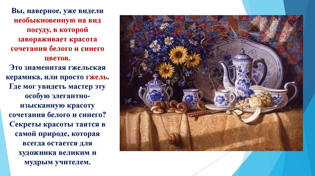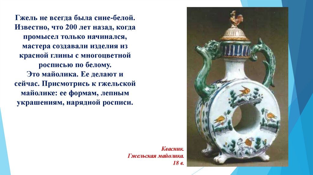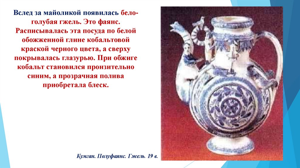 Вслед за майоликой появилась белоголубая гжель. Это фаянс.Расписывалась эта посуда по белой