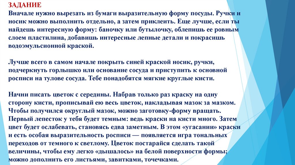 ЗАДАНИЕВначале нужно вырезать из бумаги выразительную форму посуды. Ручки и