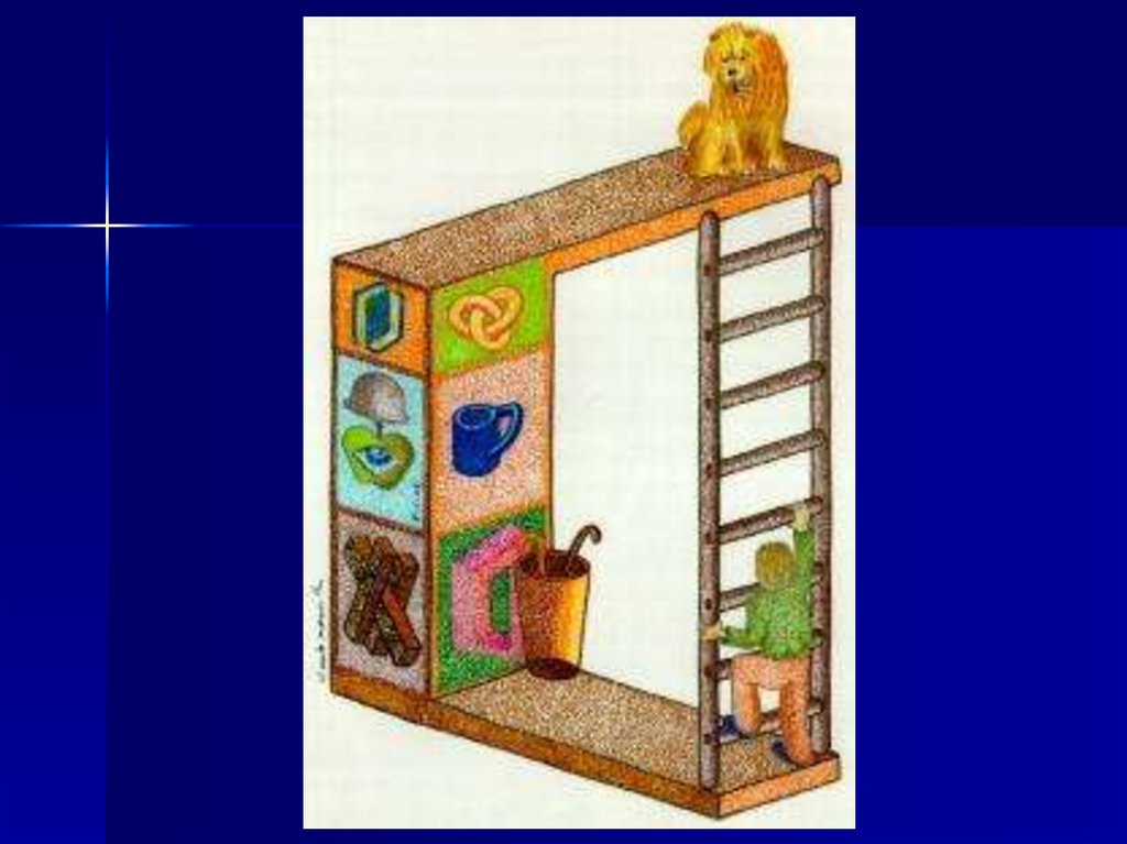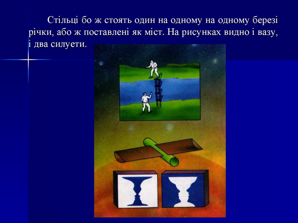 Стільці бо ж стоять один на одному на одному березірічки, або ж поставлені як міст. На рисунках видно і вазу,