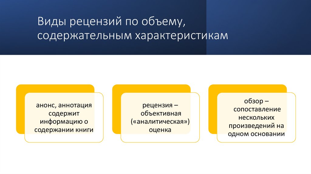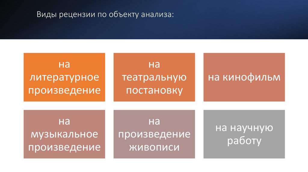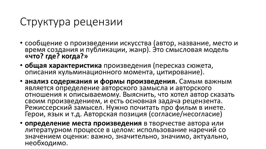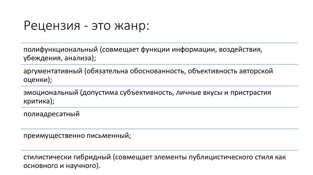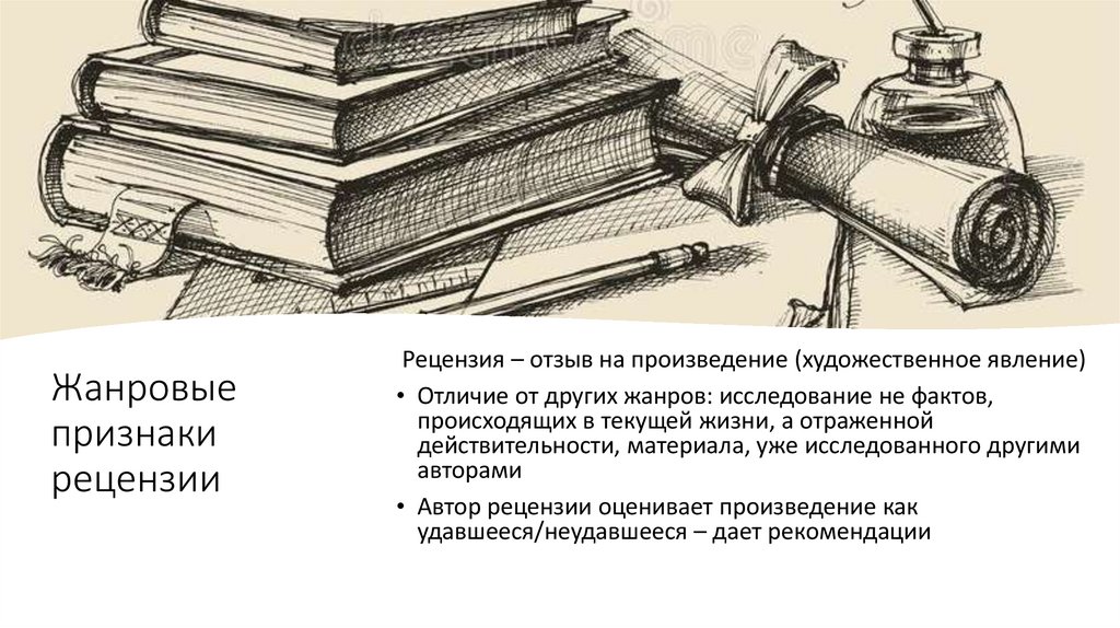 Рецензия – отзыв на произведение (художественное явление)• Отличие от других жанров: исследование не фактов,