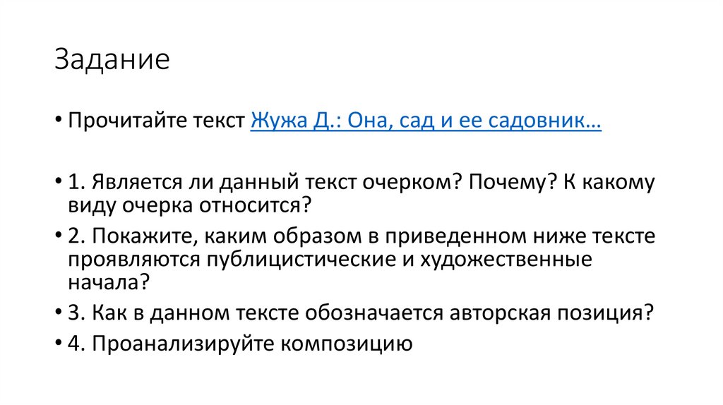 • Прочитайте текст Жужа Д.: Она, сад и ее садовник…• 1. Является ли данный текст очерком? Почему? К какому