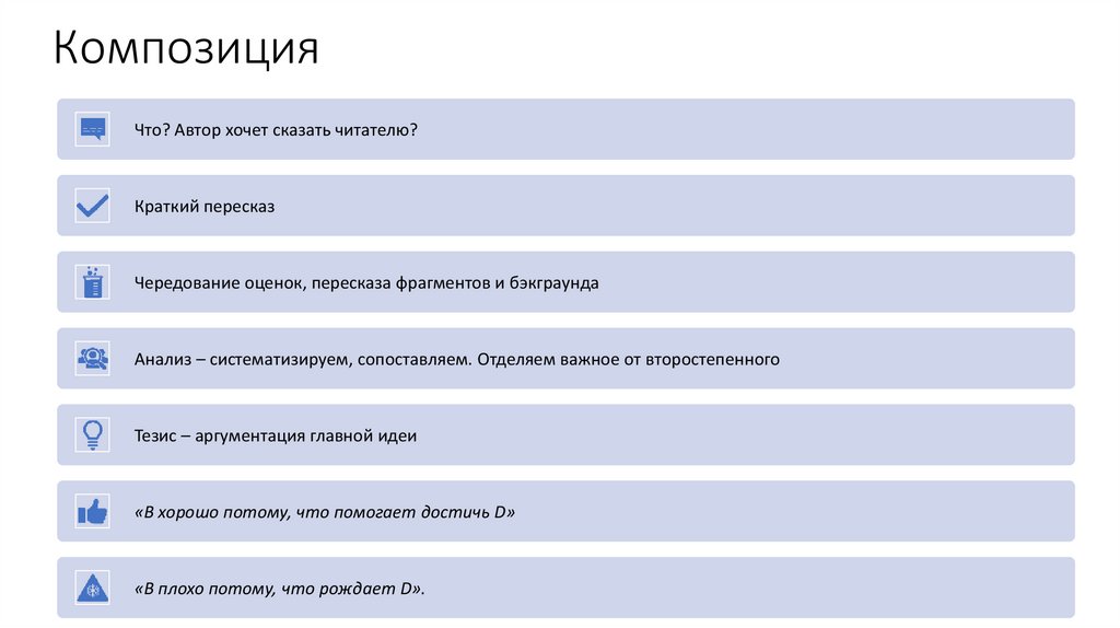 Чередование оценок, пересказа фрагментов и бэкграунда