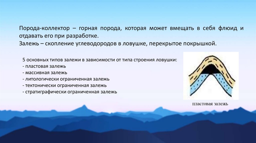Залежь – скопление углеводородов в ловушке, перекрытое покрышкой.