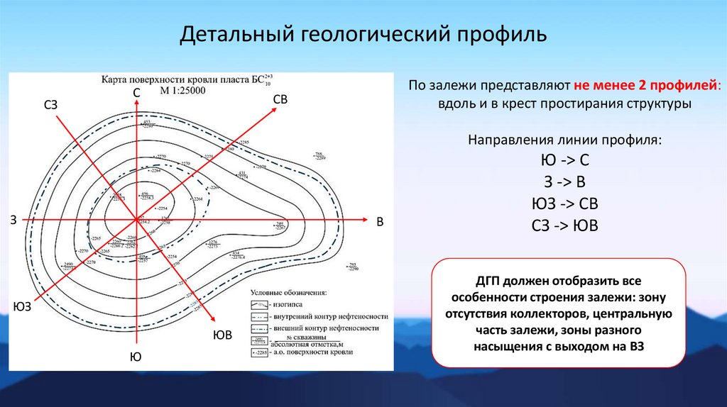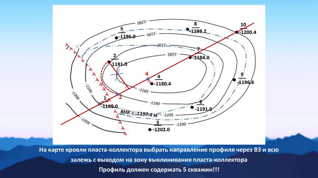 1. На карте кровли пласта-коллектора выбрать направление детальногогеологического профиля по направлению через ВЗ и всю залежь с выходом на