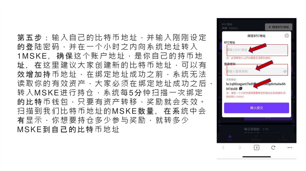 第五步 输入自己的比特币地址 并输入刚刚设定的登陆密码 并在一个小时之内向系统地址转入
