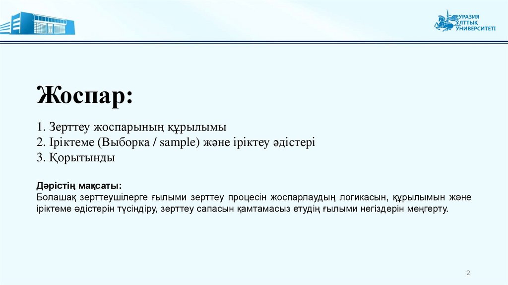 іріктеме әдістерін түсіндіру, зерттеу сапасын қамтамасыз етудің ғылыми негіздерін меңгерту.