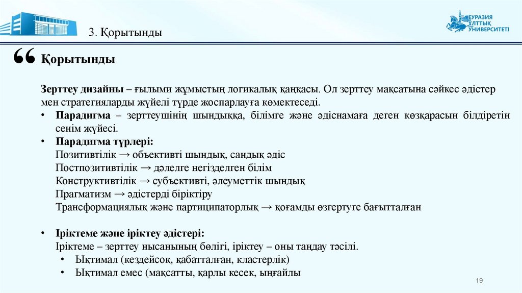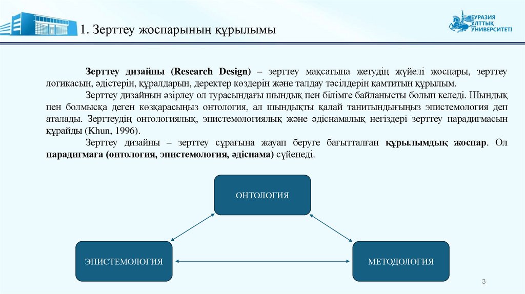 • Зерттеу дизайны — зерттеу стратегиясын ұйымдастыру тәсілі;