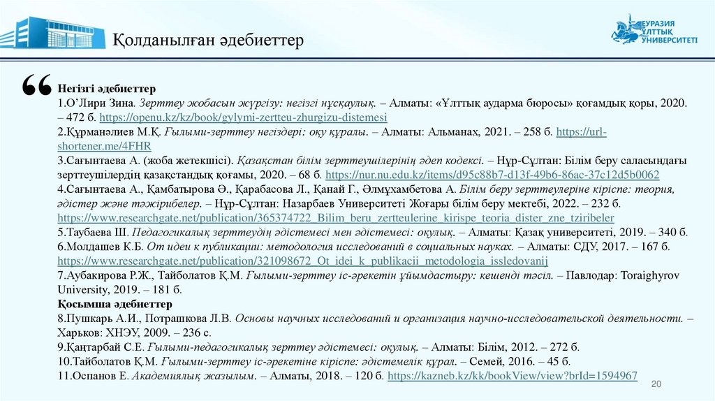 зерттеушілердің қазақстандық қоғамы, 2020. – 68 б. https://nur.nu.edu.kz/items/d95c88b7-d13f-49b6-86ac-37c12d5b0062