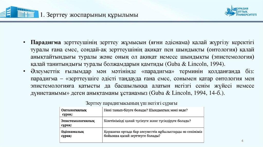 • Парадигма – зерттеушінің шындыққа, білімге және әдіснамаға деген көзқарасын білдіретін