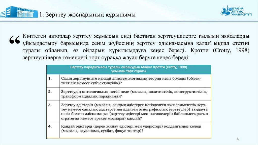 туралы ойланып, өз ойларын құрылымдауға кеңес береді. Кротти (Crotty, 1998)