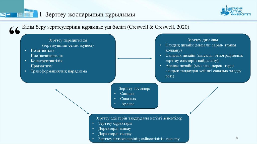 Білім беру зерттеулерінің құрамдас үш бөлігі (Creswell & Creswell, 2020)
