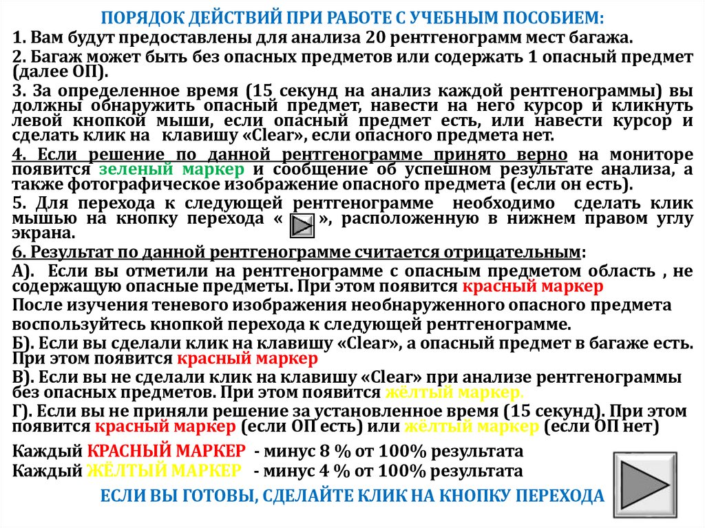 ПОРЯДОК ДЕЙСТВИЙ ПРИ РАБОТЕ С УЧЕБНЫМ ПОСОБИЕМ:1. Вам будут предоставлены для анализа 20 рентгенограмм мест багажа.