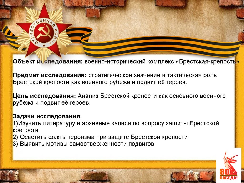 Объект исследования: военно-исторический комплекс «Брестская-крепость»Предмет исследования: стратегическое значение и тактическая роль