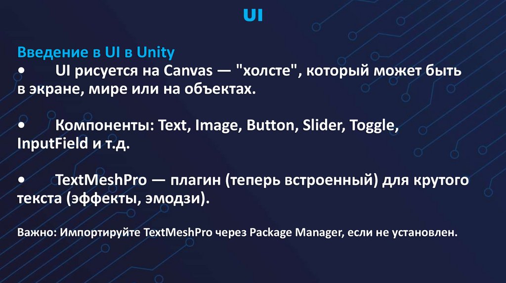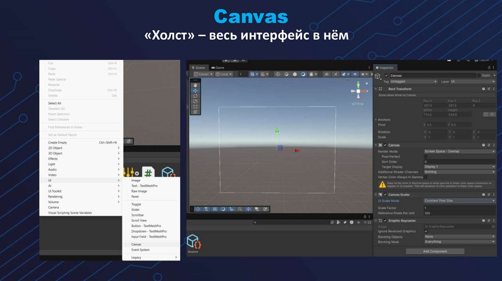 Введение в UI в UnityUI рисуется на Canvas — "холсте", который может быть
