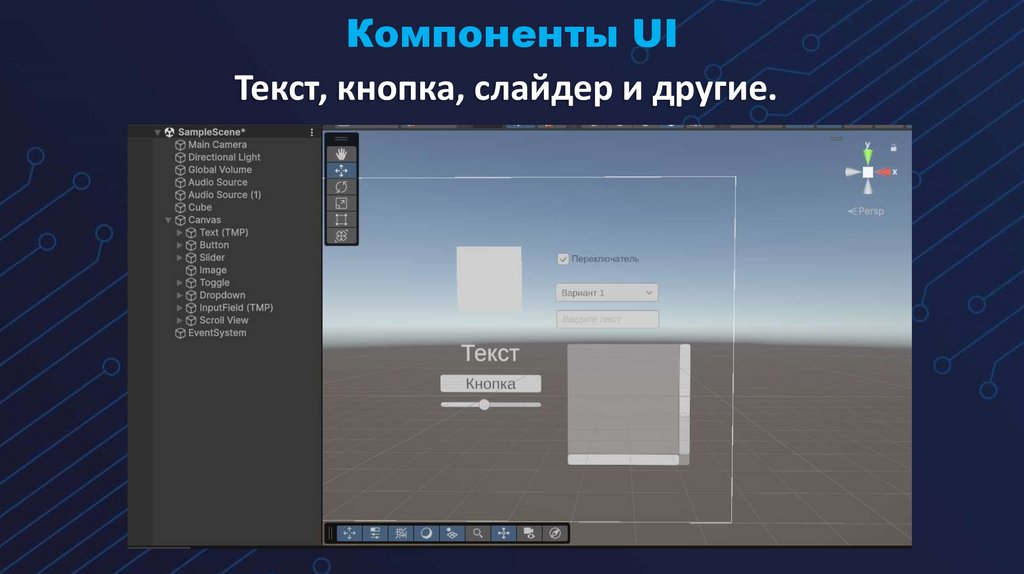 Компоненты: Text, Image, Button, Slider, Toggle,